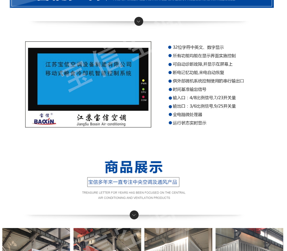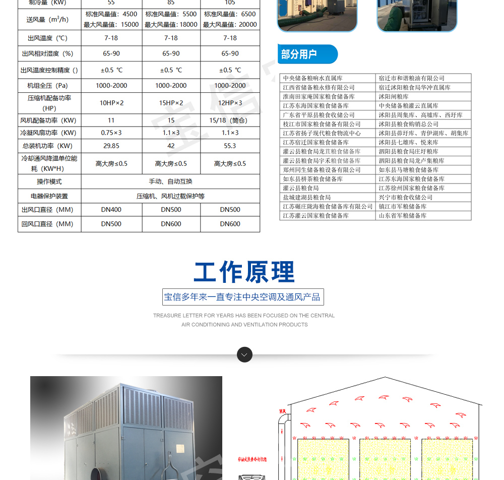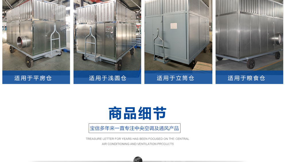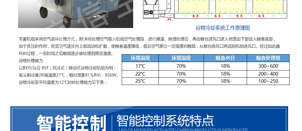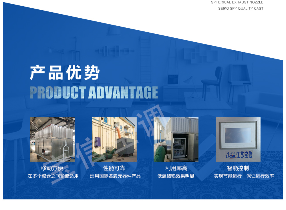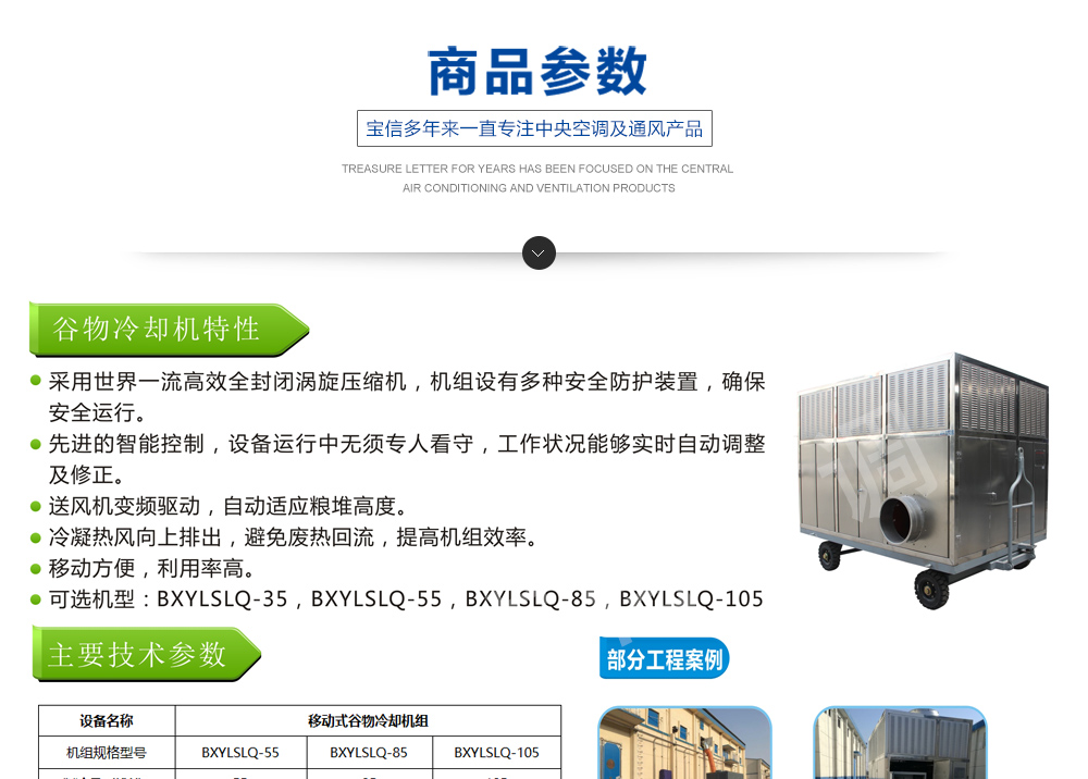 移動式糧食冷卻機組主要由風(fēng)(水)冷壓縮機制冷除濕系統(tǒng),空氣循環(huán)系統(tǒng),智能控制系統(tǒng)和移動式基座組成。該空凋設(shè)備是專門針對我國糧食倉儲環(huán)境特點和氣候特征綜合分析而特別設(shè)計的移動設(shè)備,是各糧食儲備庫實現(xiàn)綠色儲糧、科學(xué)保糧目標的重要保障手段,其性能達到國內(nèi)先進水平。該產(chǎn)品適用于:應(yīng)急處理發(fā)熱糧食、安全保存高水分糧食、優(yōu)質(zhì)稻谷的低溫儲存等,可用于平房倉、淺圓倉、立筒倉的糧食冷卻除濕作業(yè)。