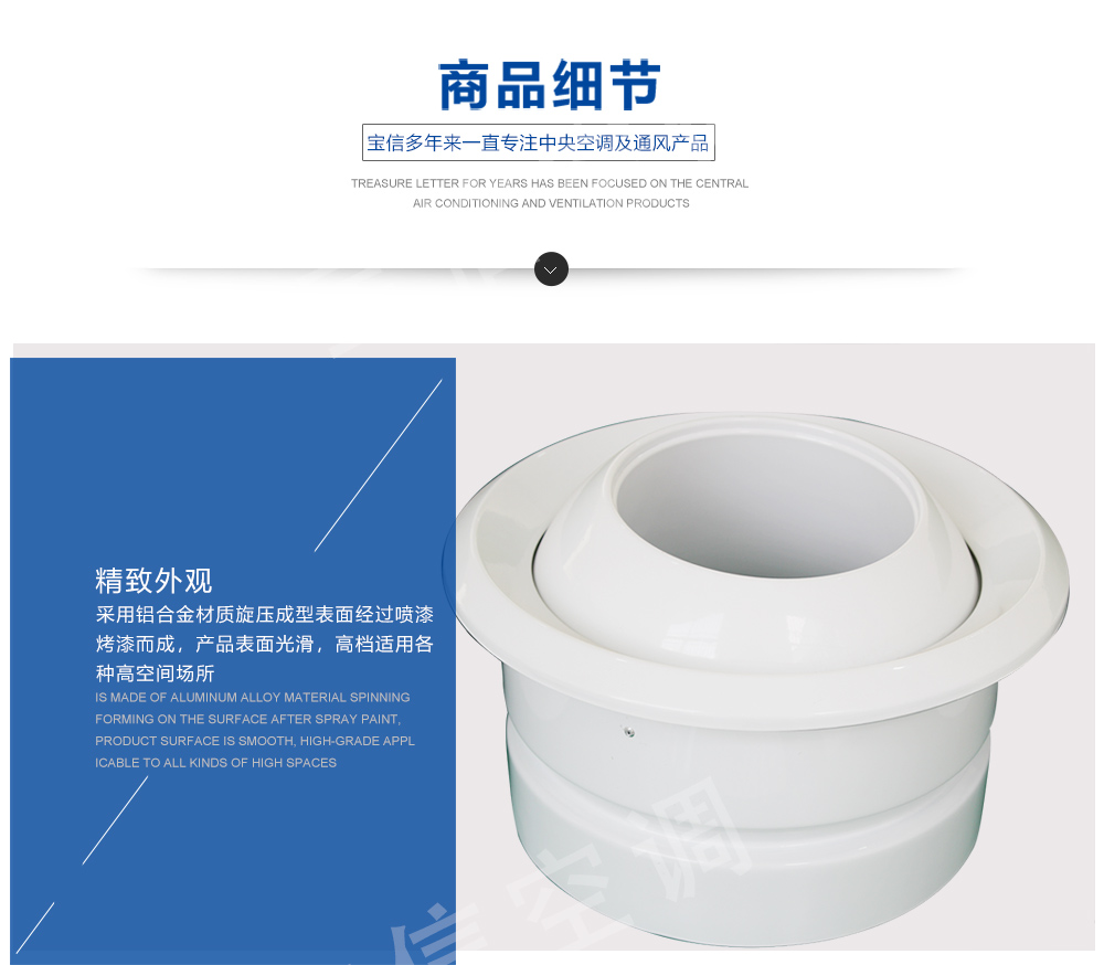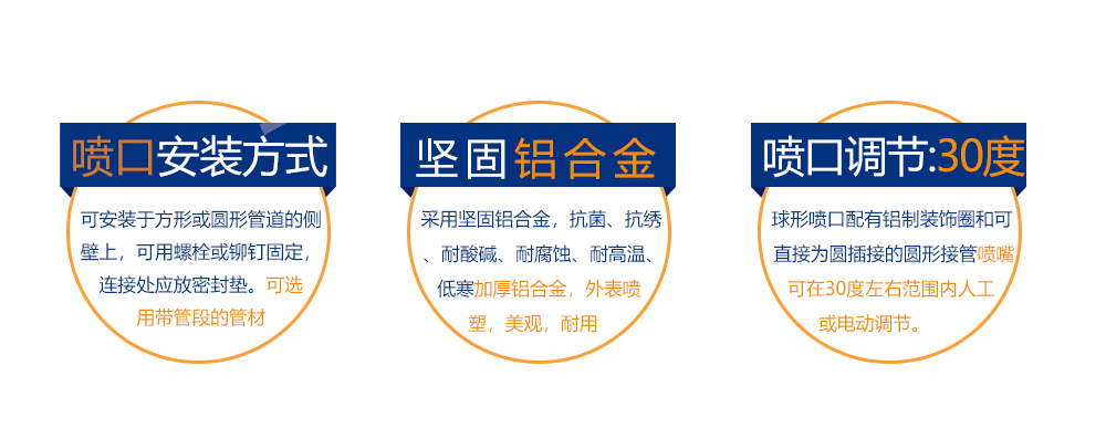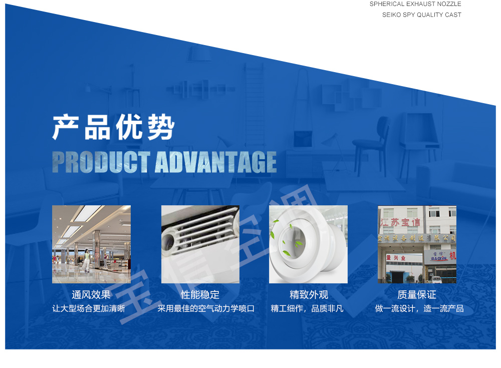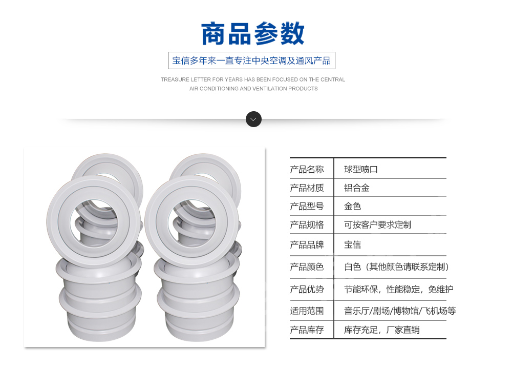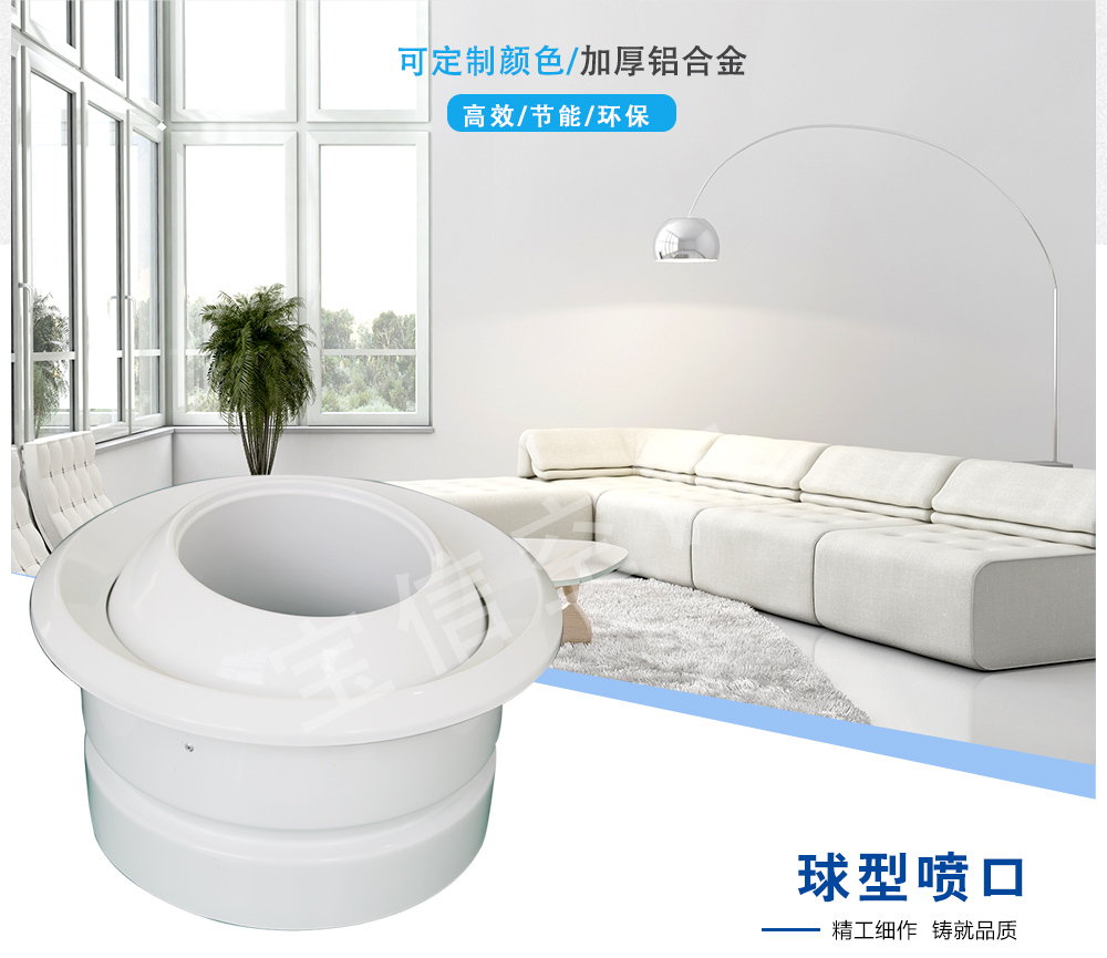 球形可調(diào)風(fēng)口是一種噴口型送風(fēng)口,高速氣流在經(jīng)過(guò)閥體噴口中對(duì)指定方向送風(fēng),氣流噴射方向可在頂角為35°的圓錐形空間內(nèi)前后左右方便地調(diào)節(jié),氣體流量也可通過(guò)閥門(mén)開(kāi)合程度來(lái)調(diào)節(jié)。造用于高大層頂高速送風(fēng)或局部供冷的場(chǎng)合,如機(jī)場(chǎng)候機(jī)大廳,室內(nèi)體育場(chǎng),賓館廚房等場(chǎng)合。