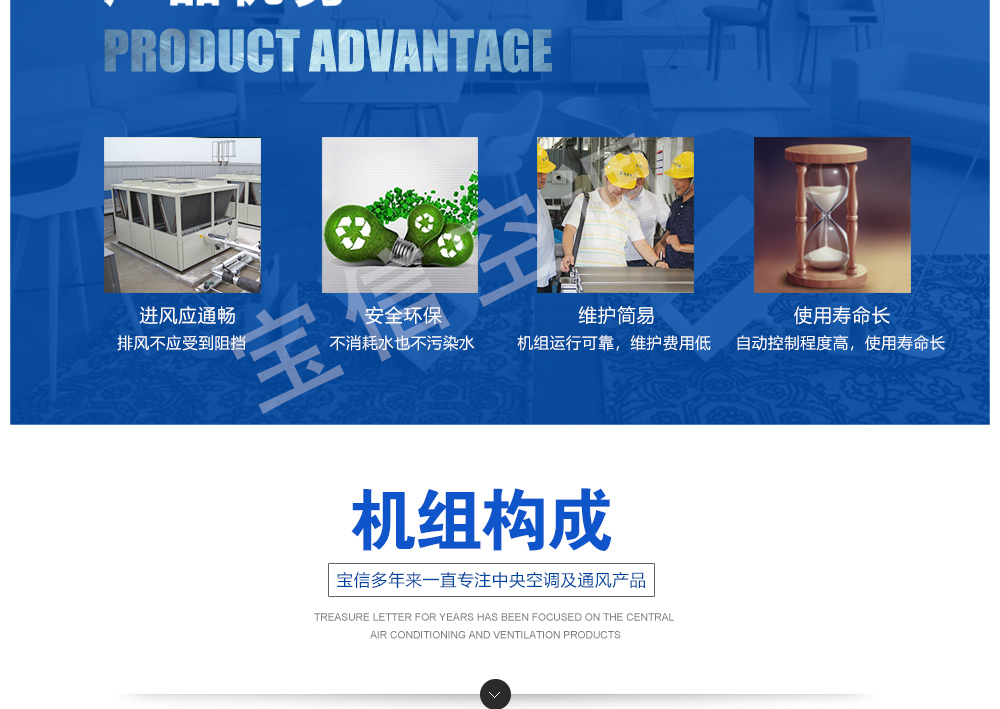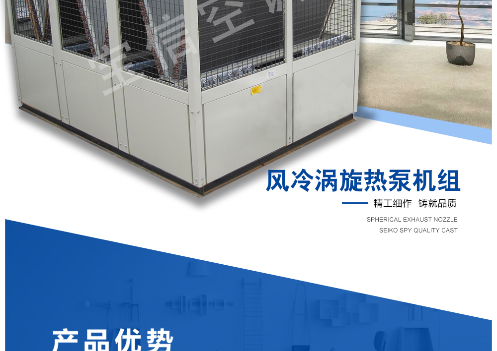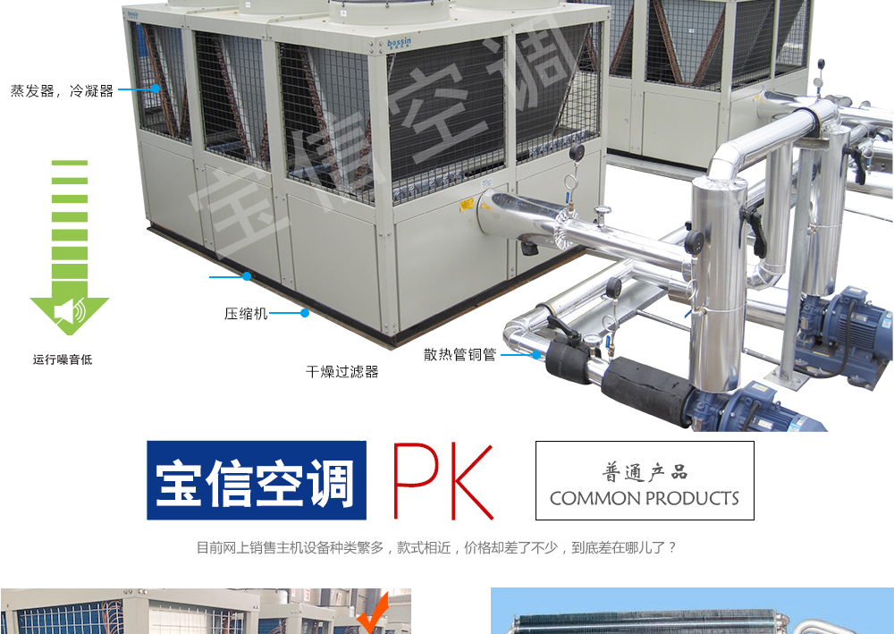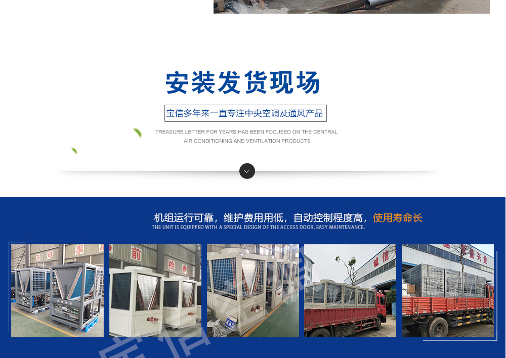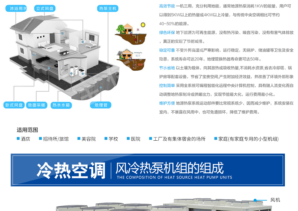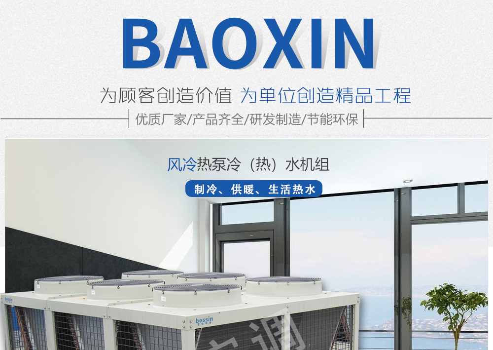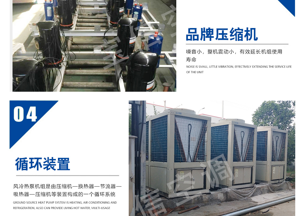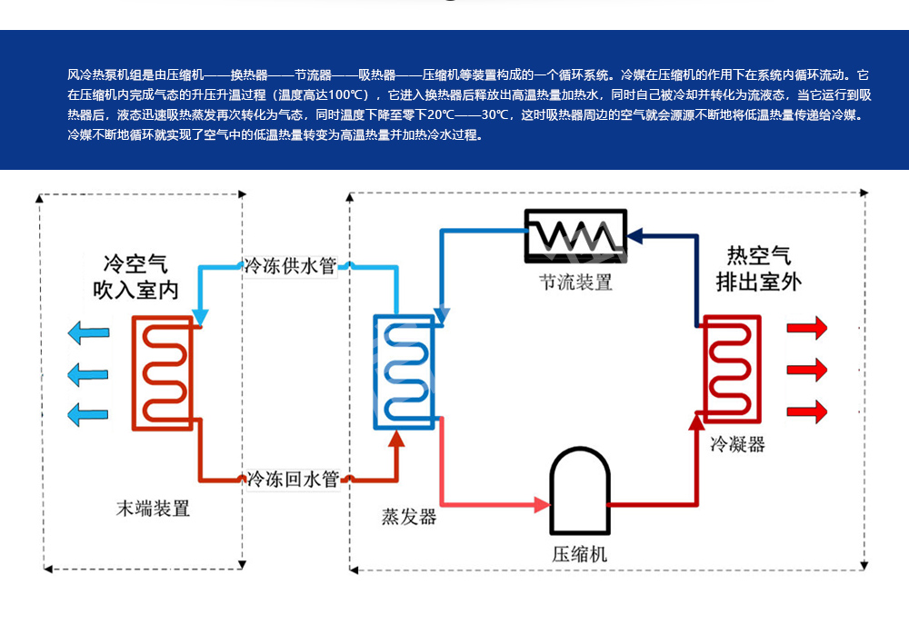 風(fēng)冷熱泵機(jī)組是由壓縮機(jī)——換熱器——節(jié)流器——吸熱器——壓縮機(jī)等裝置構(gòu)成的一個循環(huán)系統(tǒng)。冷媒在壓縮機(jī)的作用下在系統(tǒng)內(nèi)循環(huán)流動。它在壓縮機(jī)內(nèi)完成氣態(tài)的升壓升溫過程(溫度高達(dá)100℃),它進(jìn)入換熱器后釋放出高溫?zé)崃考訜崴?,同時自己被冷卻并轉(zhuǎn)化為流液態(tài),當(dāng)它運(yùn)行到吸熱器后,液態(tài)迅速吸熱蒸發(fā)再次轉(zhuǎn)化為氣態(tài),同時溫度下降至零下20℃——30℃,這時吸熱器周邊的空氣就會源源不斷地將低溫?zé)崃總鬟f給冷媒。冷媒不斷地循環(huán)就實(shí)現(xiàn)了空氣中的低溫?zé)崃哭D(zhuǎn)變?yōu)楦邷責(zé)崃坎⒓訜崂渌^程。