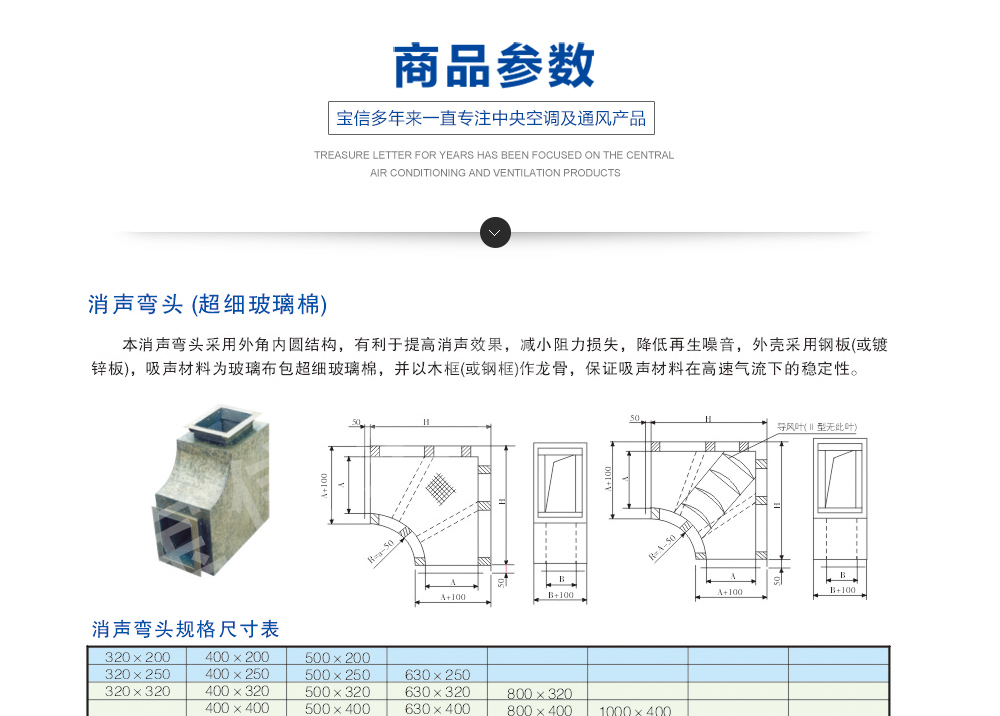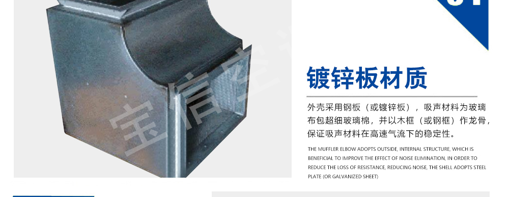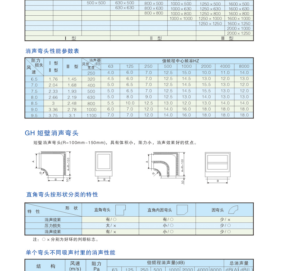 本消聲彎頭采用外角內(nèi)圓結(jié)構(gòu),有利于提高消聲效果,減小阻力損失,降低再生噪音,外殼采用鋼板(或鍍鋅板),吸聲材料為玻璃布包超細(xì)玻璃棉,并以木框(或鋼框)作龍骨,保證吸聲材料在高速氣流下的穩(wěn)定性。